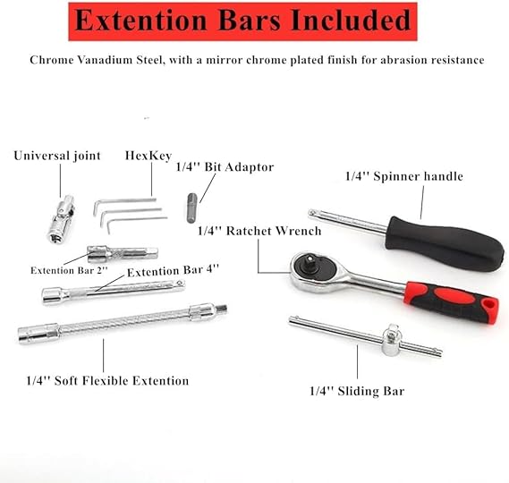 • What’s in the box: 46-Piece Tool Set Includes: 13pcs 1/4@ drive sockets (4-14mm), 21pcs drive bit sockets (PH/PZ/FD/HW/T sizes), U-Joint, Flexible Extension Bar, Spinner Handle, 2-inch and 4-inch Extension Rods, Sliding T-Bar, 72T Ratchet Handle, 3pcs Hex Key Wrenches (1.25-2.5mm), Slotted Bits (4mm, 5.5mm, 7mm), 2pcs 1/4@ drive extension bars, 1pc quick ratchet, 1pc universal joint, 1pc sliding bar, 1pc soft flexible extension, all stored in a durable blow case for easy storage and portability.