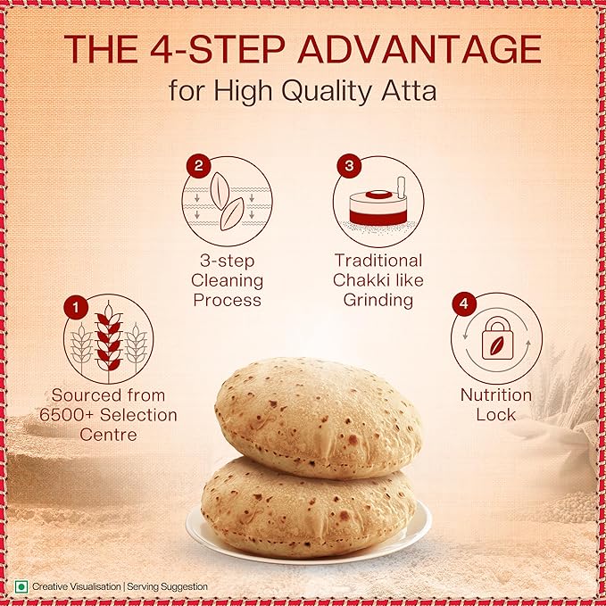 • FINEST QUALITY ATTA: The 4-step advantage process of sourcing, cleaning, grinding and nutrition lockage ensures high-quality atta