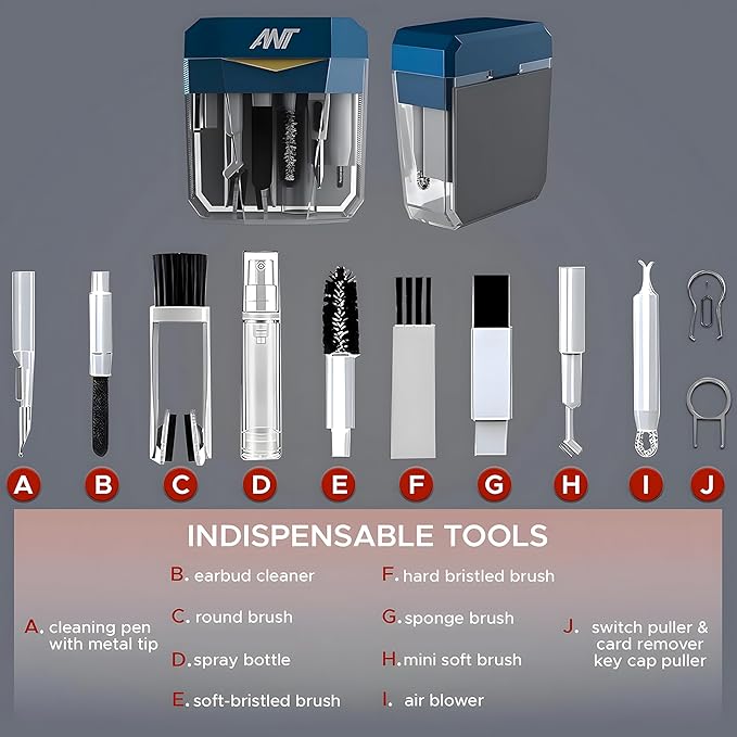 • Multi-purpose Cleaning Kit: Electronic cleaning kit includes cleaning pen with metal tip, sponge brush, mini soft brush, round brush, keyboard brush, keycap puller, switch puller, spray bottle, fibre fleece swipe, air blower with long and short nozzles, lens cleaning pen with soft pad, hard bristled brush and soft-bristled brush, and a card remover. The cleaner kit can efficiently clean laptops, keyboards, headphones, screens, phones, etc.