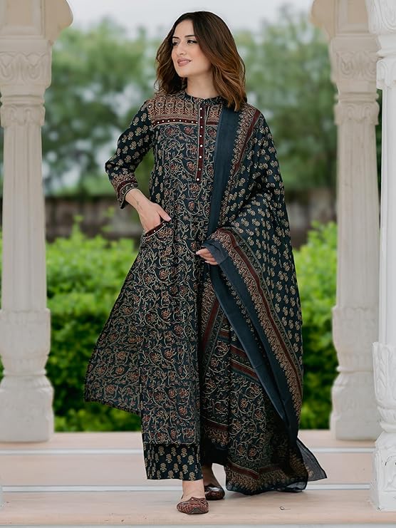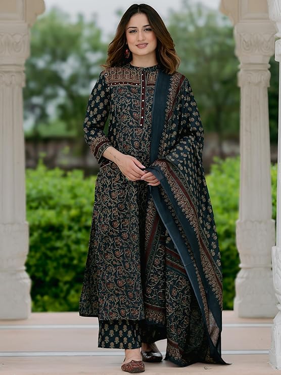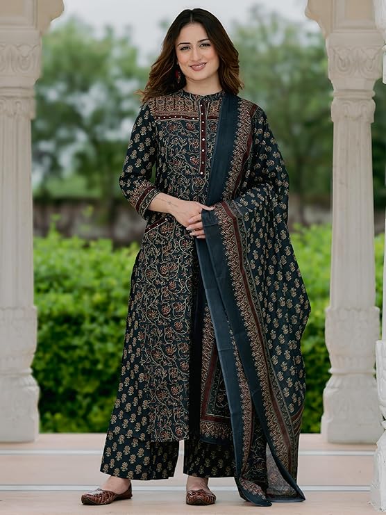 Arayna Women’s Cotton Printed Kurta Set with Palazzo Pants and Dupatta | Ethnic Straight Kurta