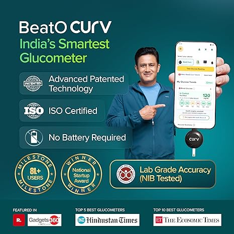 BeatO Combo: CURV Glucometer Machine (Android Type-C) + 15-Day CGM Continuous Glucose Monitor | Smart Sugar Test Machine for Home | Real-Time Blood Sugar Monitoring Device with Strips | Best Glucometer for Accurate Results