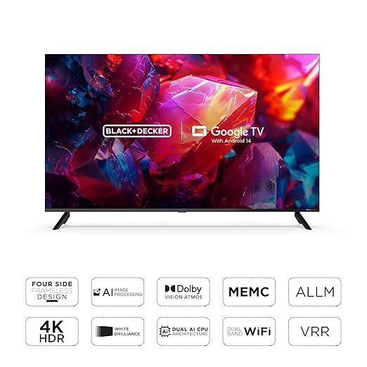 4-Side Frameless Design, Google TV Android 14, Latest AI enabled 2875 Chipset, 4K 60Hz, DLG, Micro dimming, , IMG BXE, Open GL ES3.2, VRR, ALLM, MEMC, 178° Wide Viewing Angle, Personalised Content Suggestion, eARC, High Fidelity Speakers, Super Brightness, HDR10- HLG, Dolby Audio, Integrated Bluetooth4-Side Frameless Design, Google TV Android 14, Latest AI enabled 2875 Chipset, 4K 60Hz, DLG, Micro dimming, , IMG BXE, Open GL ES3.2, VRR, ALLM, MEMC, 178° Wide Viewing Angle, Personalised Content Suggestion… See more |