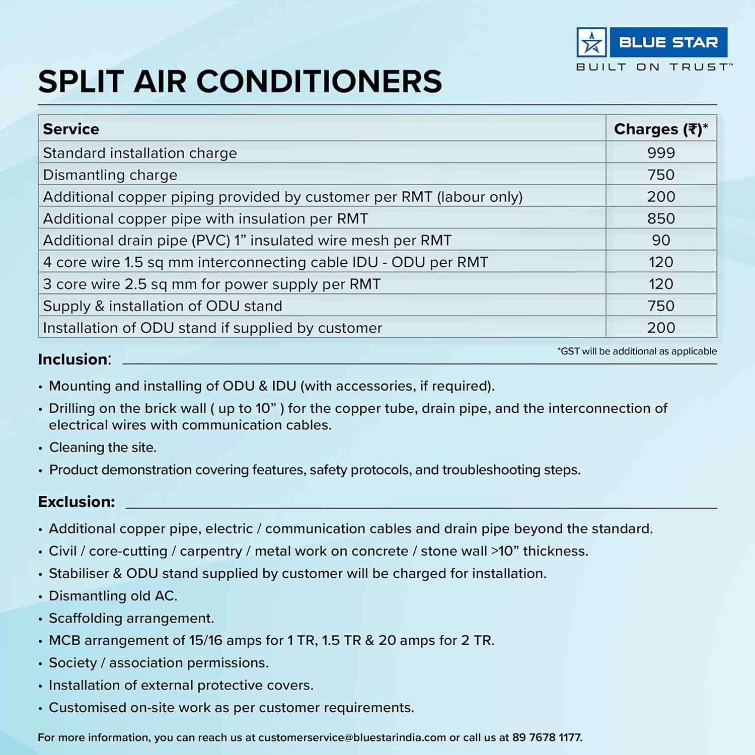 • Manufacturer Warranty: 1 Year on Product, 10 Years on Inverter Compressor(T&C*).Covers-comprehensively all repairs, rectification, or replacement of Components like Electronic PCB, IDU Evaporating Coil & ODU Condenser Coil. Excludes all types of air filters, plastic and metal parts, remote handset & gas charging.Gas charging associated with Compressor/Evaporator/Condenser coil to be paid by customer. This applies to residential usage only.