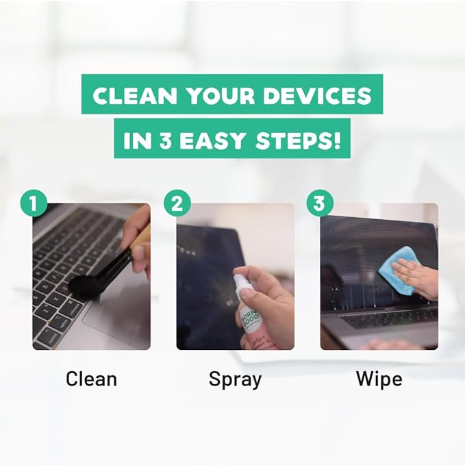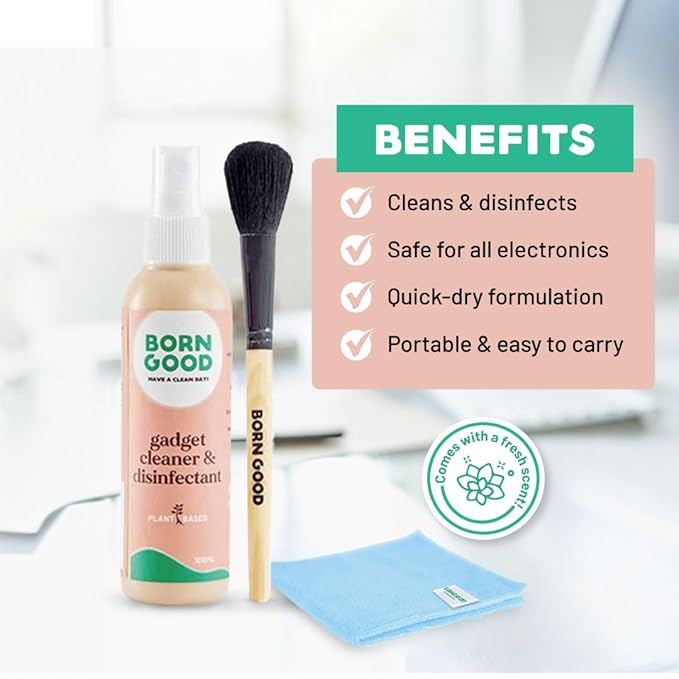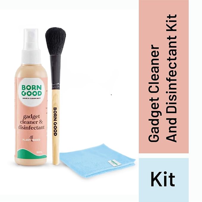 Born Good 3-in-1 Plant-Based Electronics & Gadget Disinfectant Cleaner Kit for Laptop, Smartphone, Monitor, Tablet, Camera, TVs with 1 Microfiber Cloths & Soft Brush