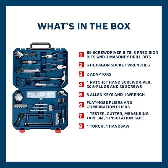 • Comprehensive Tool Selection: The BOSCH 108 pcs Multi-Function Household Set is curated toolkit featuring essential hand tools and bits, all neatly organized in a compact suitcase for easy portability, making it perfect for tasks ranging from basic repairs to professional projects. BOSCH hand tools are crafted from premium materials and designed with ergonomic handles for comfortable, long-lasting use.