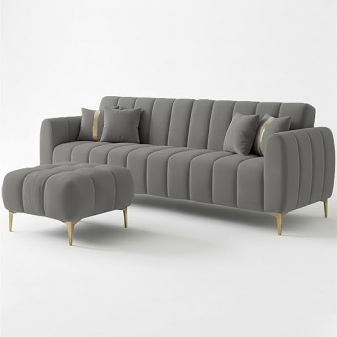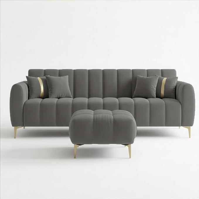 CASASTYLE Hanster 3 Seater Velvet Fabric Sofa Set with Extra Ottoman (Dark Grey) with Golden Finish Legs | Durable & Comfortable | Ideal for Living Room