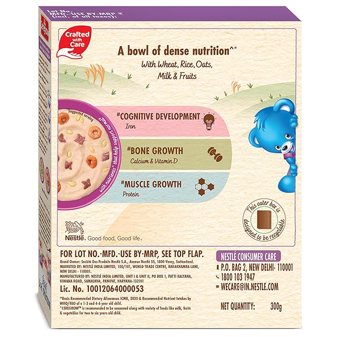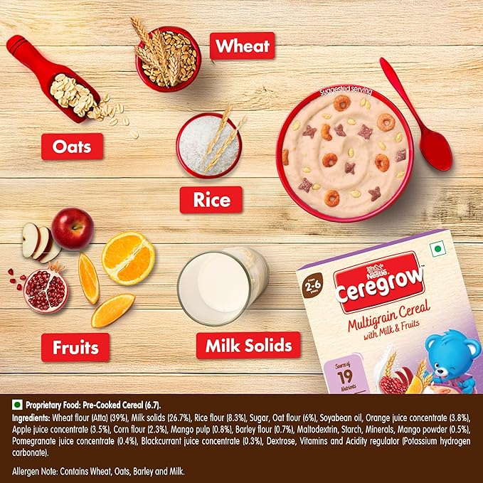 CEREGROW Multigrain Milk & Fruits Cereal | With Iron, Protein, Calcium | 19 Nutrients | 300g, Bag-in-box Pack