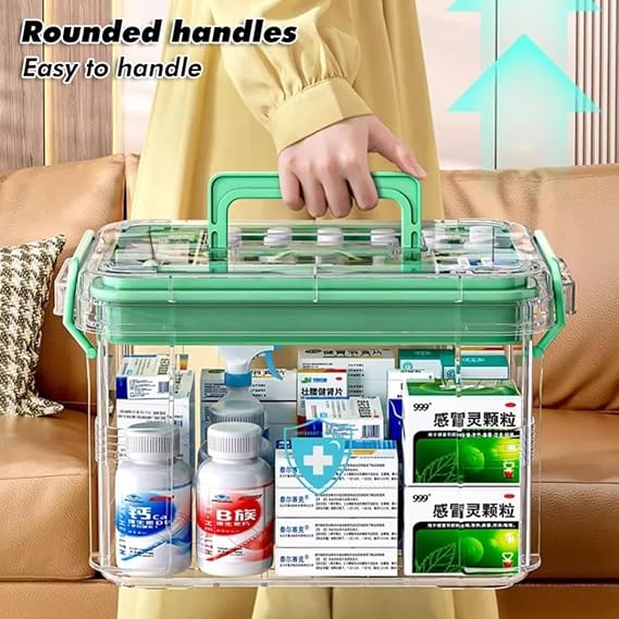 Clear Plastic Medicine Storage Box Organizer, Family Emergency Kit with Removable Pill Case Portable Lockable Container for, Art Craft and Cosmetic Household Organizer (Green, Small)