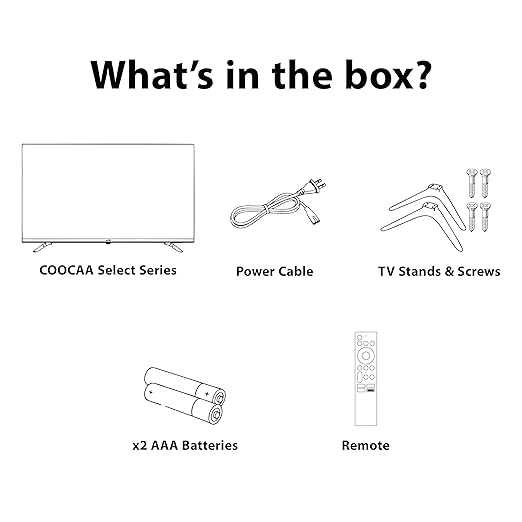 Mounting Hardware ‎TV Unit-1N, Stand Bases-2N, Quick Start Guide-1N, Warranty Card 1N, Remote-1N, Batteries-2N, Power cord-1N,Screws-4N, AV Converting Cable-1N