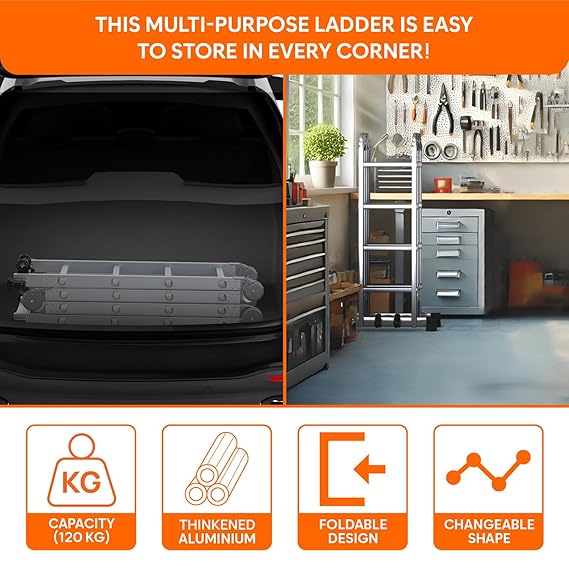 • Product Dimensions: The ladder extends up to 14.5 ft, and in its A-step configuration, it reaches 7.25 ft. When folded, its size is 118 x 35 x 26 cm. It has 16 steps (4 sections with 4 steps each), weighing 12.8 kg, with a load capacity of 120 kg. This multipurpose ladder is perfect for both indoor and outdoor use.