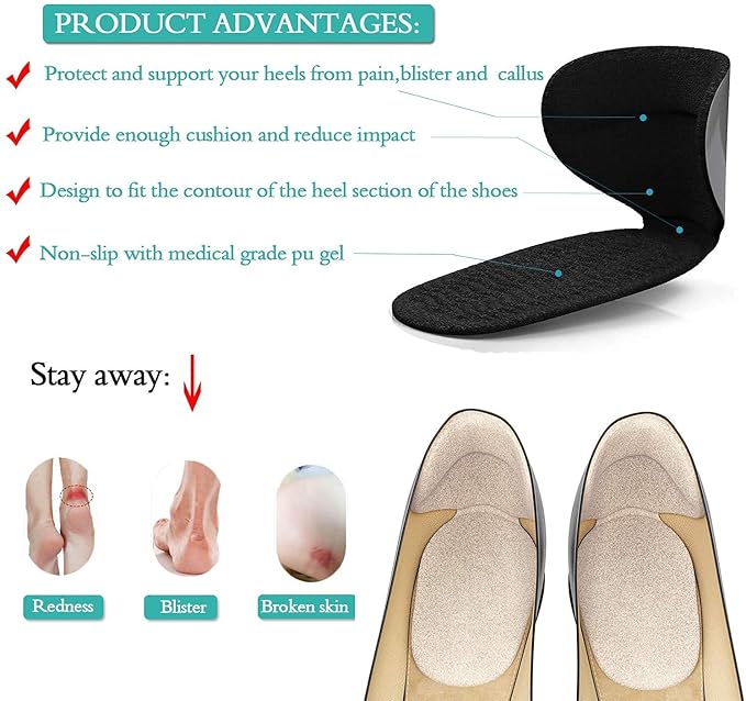 • Wide Application - These heel cushion pads fit for many shoes such as high-heels, leather shoes; They are applicable to new shoes and slightly bigger shoes, suitable for all people.