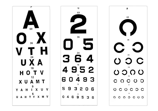• COMPREHENSIVE SET: Includes three professional vision test charts - alphabetical letters, numerical digits, and Landolt C rings for thorough eye examinations