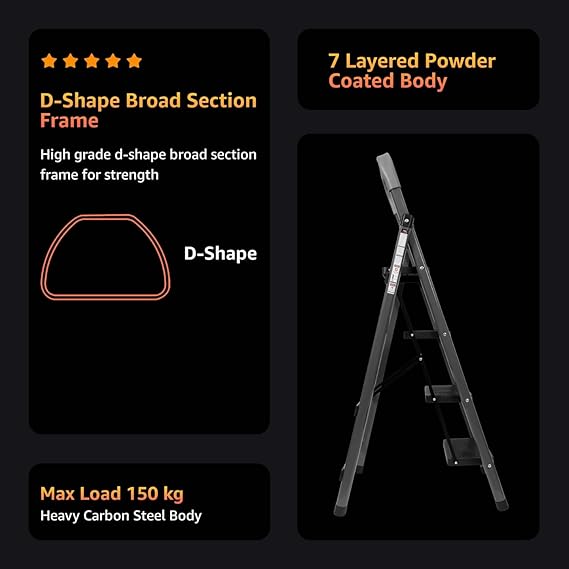 Equal 4-Step Ladder for Home | Carbon-Series Steel Folding Step Ladder with Wide Anti-Skid Steps