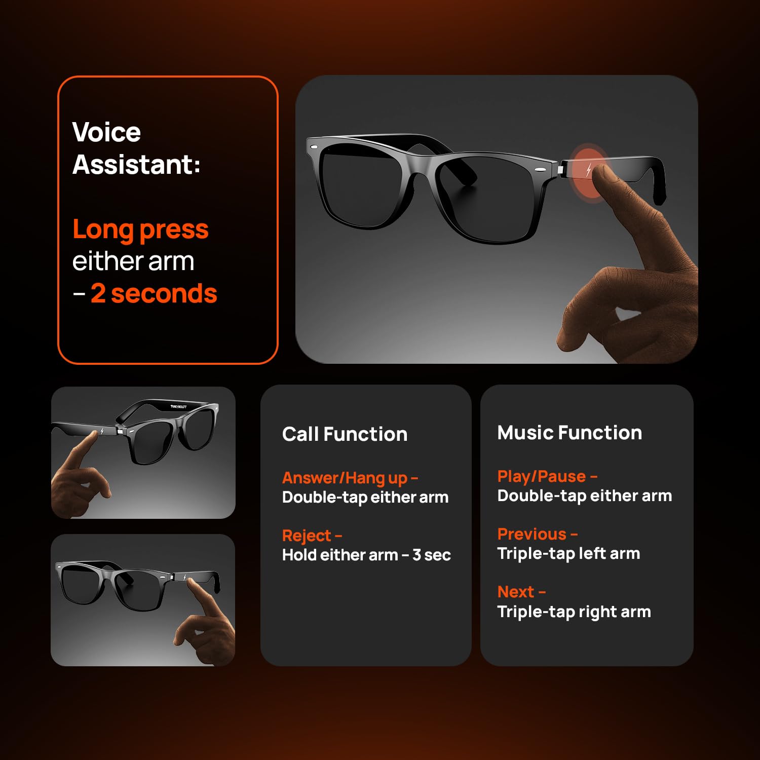 • Fast Charging + Long Battery Backup - Just 15 minutes of charge = 4 hours of use. Enjoy up to 6 hours playtime and 72 hours standby thanks to dual 60mAh batteries. Quick-charge technology ensures your smart glasses are always ready when you are.