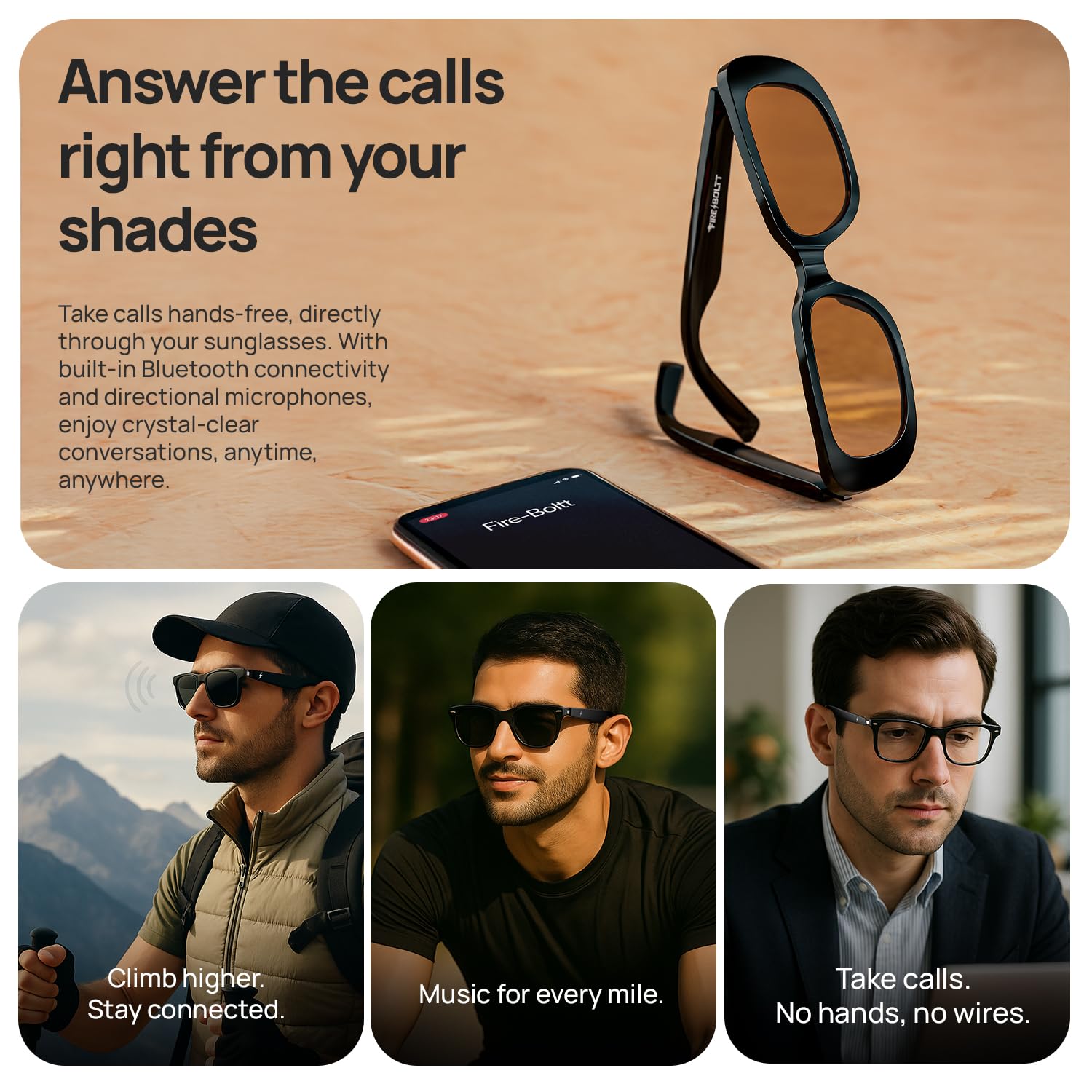 Fire-Boltt Fire-Lens Dune Smart Glasses, Bluetooth Calling & Open-Ear Bluetooth Sunglasses with HD Sound & Smart Audio Touch Controls Voice Assistant (Siri/Alexa/Google), Fast Charging for Men & Women
