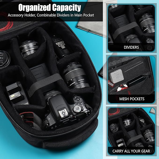 • Versatile Multi-Purpose Use: Easily transform this camera backpack into a casual backpack by removing the padded dividers. Perfect for daily use, it accommodates clothes, snacks, and other necessities, making it an ideal companion for photographers and travelers alike.