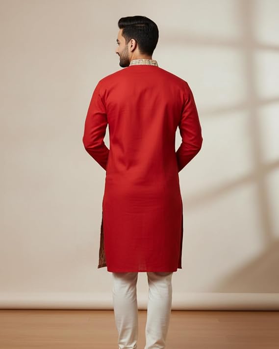 • KNEE-LENGTH CUT: Classic kurta silhouette with knee-length design that provides a sophisticated and comfortable fit suitable for various body types and formal ethnic occasions