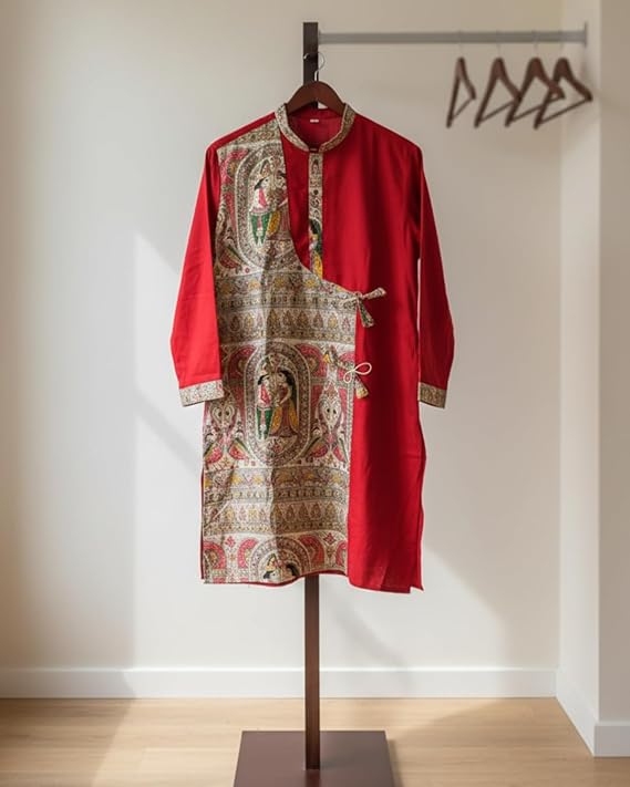 • TRADITIONAL DESIGN: Men's kurta featuring authentic Madhubani art panel with intricate printed motifs depicting traditional Indian folk art in vibrant colour fabric