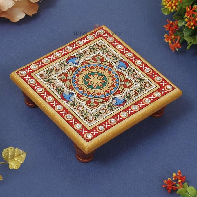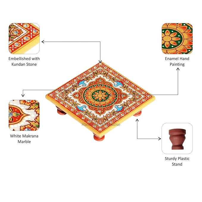• This marble chowki is hand-made and hand-painted using emboss work, enamel, and stone work
