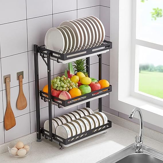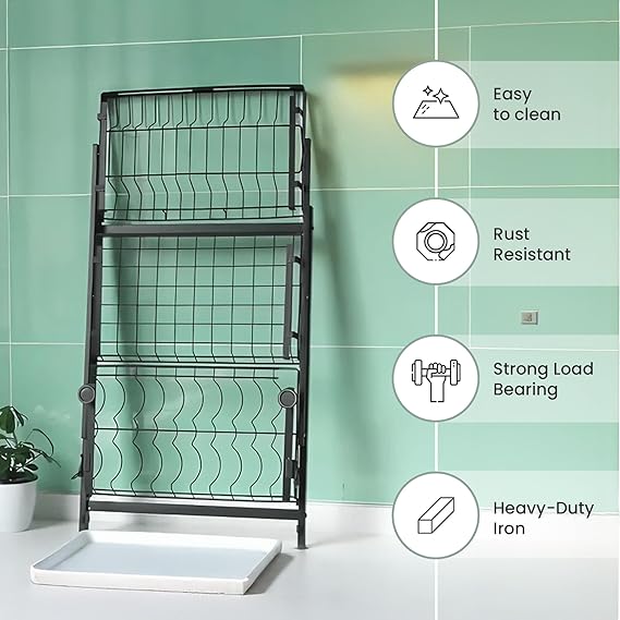 HomeEssentials 3-Tier Dish Drying Rack – Black Kitchen Organizer Stand for Utensils, Plates & Bowls – Space-Saving Countertop Bartan Drainer Shelf