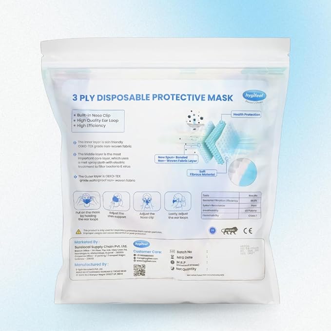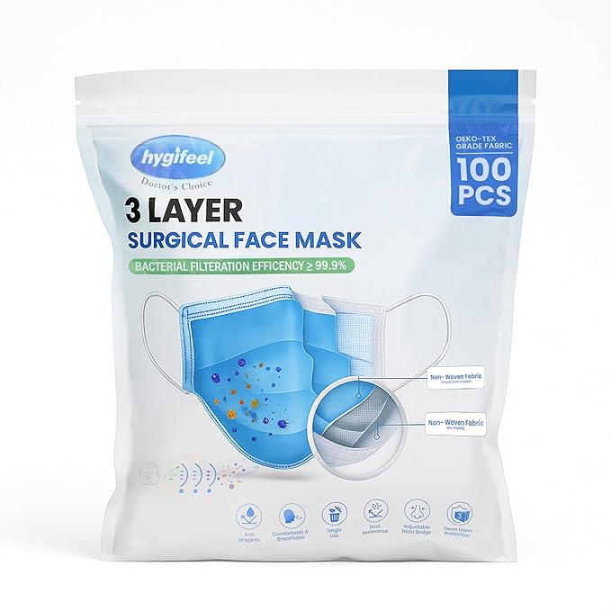 • 99.9% Bacterial Filtration Efficiency (BFE) : HYGIFEEL 3 Ply Surgical Face Mask offers ≥99.9% bacterial filtration efficiency, helping protect against dust, bacteria, pollution, droplets, and airborne particles—ideal for medical, hospital, clinic, and daily use.