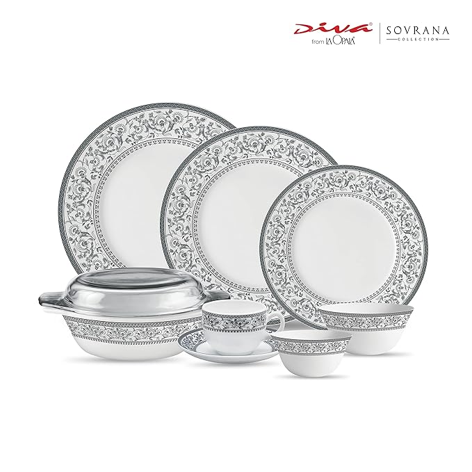 • Package Contents: 8N Full Plate (275 mm), 8N Quarter Plate (200 mm), 16N Veg Bowl (180 ml), 8N Soup Bowl (340 ml), 2N Platter (310 mm), 2N Casserole (1350 ml), 2N Casserole Lid (Clear), 8N Cup (160 ml) and 8N Saucer (135 mm)