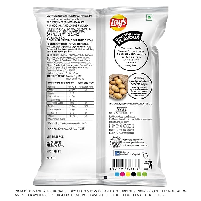 • SHELF LIFE: For the best flavour, crunch, and overall experience, Lay's American Style Cream & Onion is best consumed within 5 months