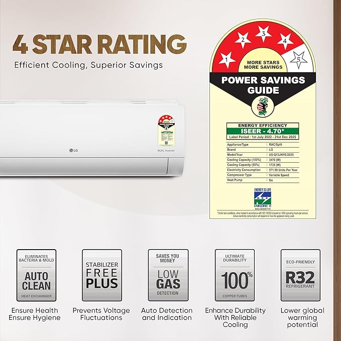 • Energy Rating: 4 Star - High energy efficiency | Annual Energy Consumption: 571.99 units. ISEER Value: 4.70 (Please Refer Energy Label on Product Page or Contact Brand for More Details)