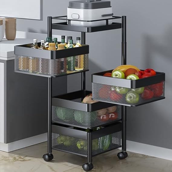 • Rolling carts with multiple baskets provide enough space for your daily storage. Fully enveloping the guardrail, encrypted wire mesh ventilation basket, allowing airflow to keep the freshness of fruits and vegetables.
