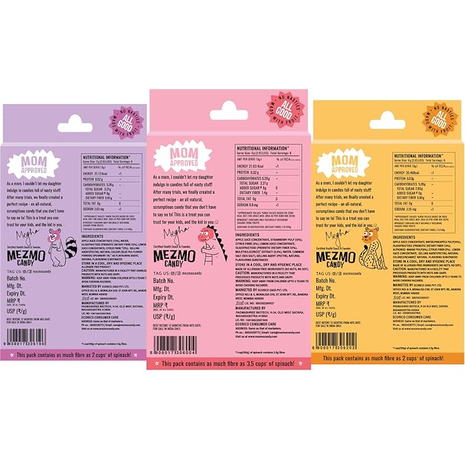 • No white sugar – Most candies contain 90% white sugar, it triggers the release of chemicals – opiods and dopamine – that activates the brain’s pleasure centre. Which makes it highly addictive. Mezmo is sweetened with fruit juice concentrate.