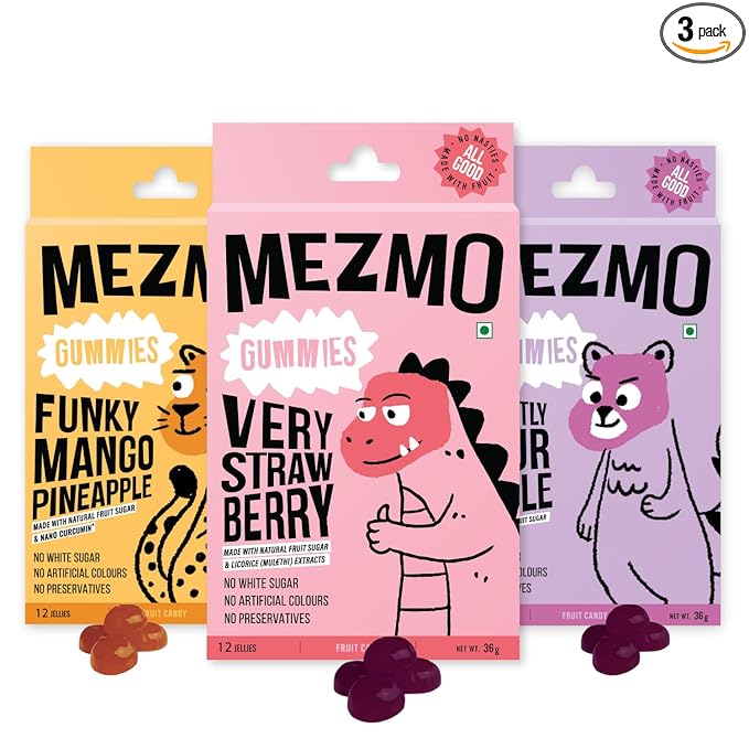MEZMO soft jelly healthy n yummy candy with natural fruit sugar 108gms 36 jellies (Pack of 3) - Very Strawberry, Funky Mango Pineapple & Sweetly Sour Apple