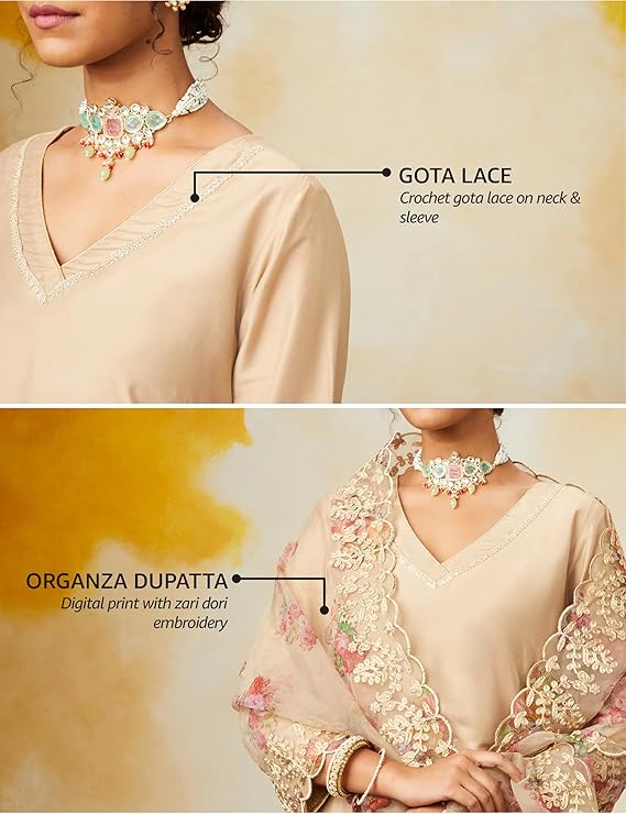 • PRODUCT DETAILS: 3-piece set featuring calf-length regular fit kurta with sequin lace at neck,, 3/4th sleeves paired with straight-fit pyjama with pocket and printed organza dupatta finished with scallop edge zari Dori embroidery.