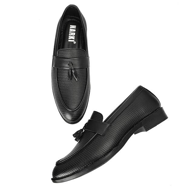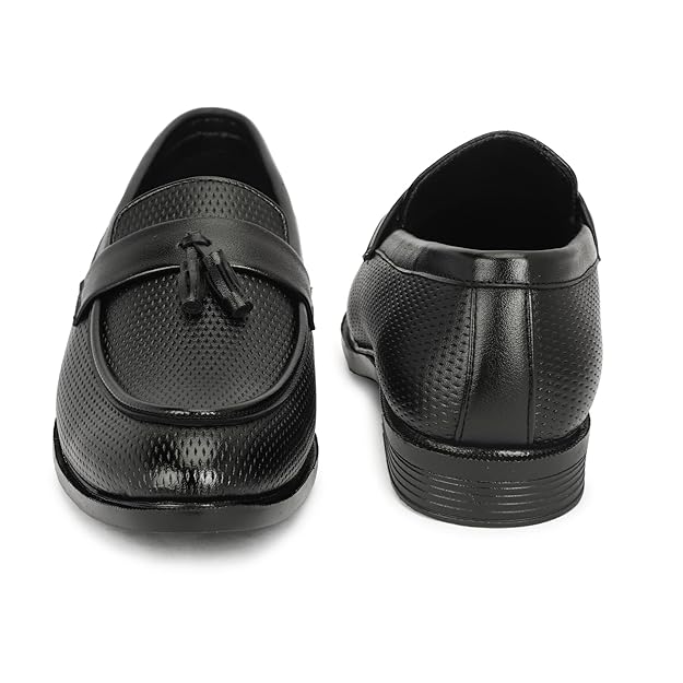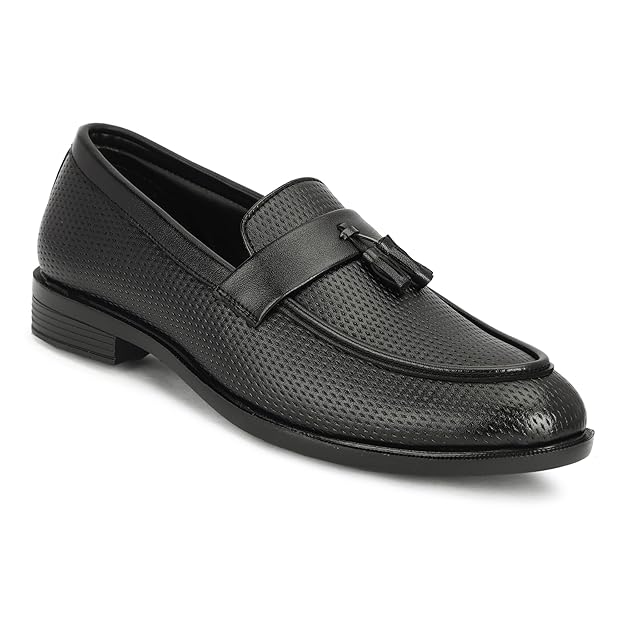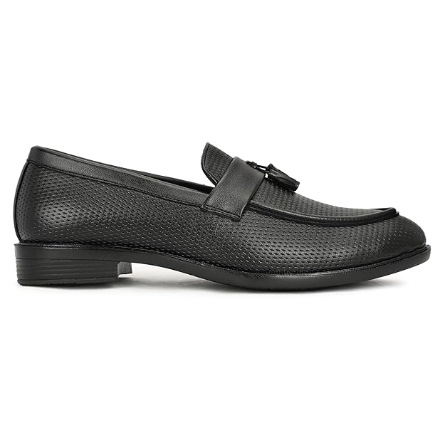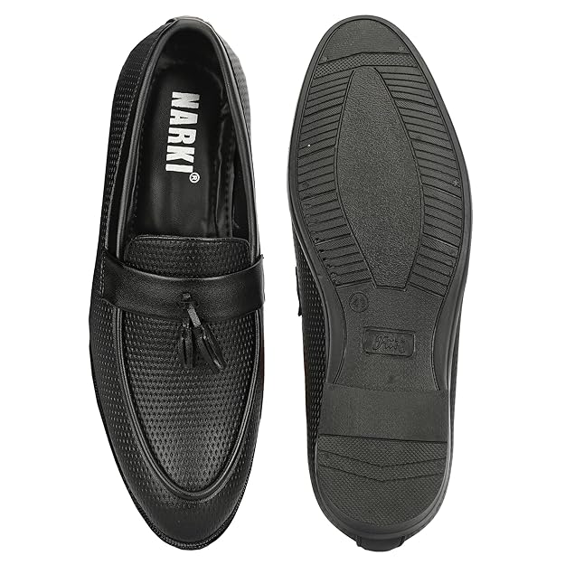NARKI Men's Black Textured Leather Tassel Loafers – Stylish Slip-On Formal Shoes for Office
