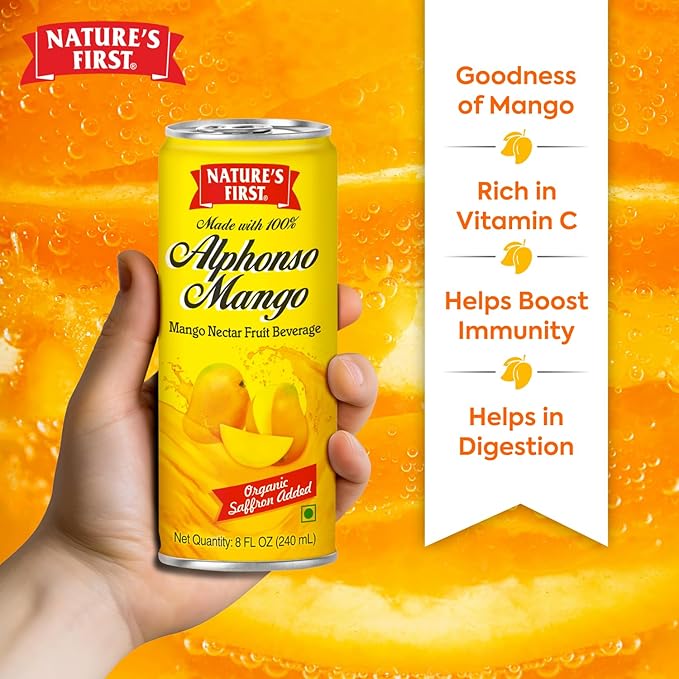 Nature's First Alphonso Mango Juice (Pack of 6 x 240ml can) with Saffron, All Natural Fruit Drink, Source of Vitamin C, Rich in Fiber