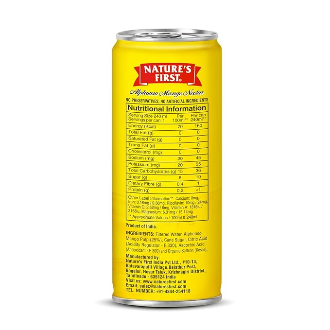 • Natural Ingredients: Nature's First Alphonso Mango Juice with Saffron is crafted from natural ingredients, offering a pure and refreshing drink. Enjoy the rich, authentic flavors of Alphonso mangoes and saffron without any artificial preservatives or additives.