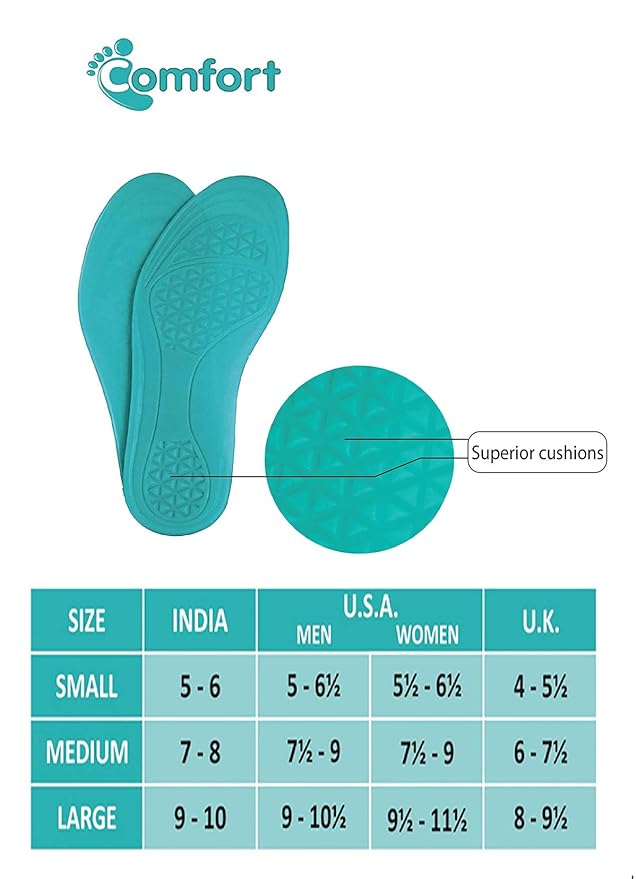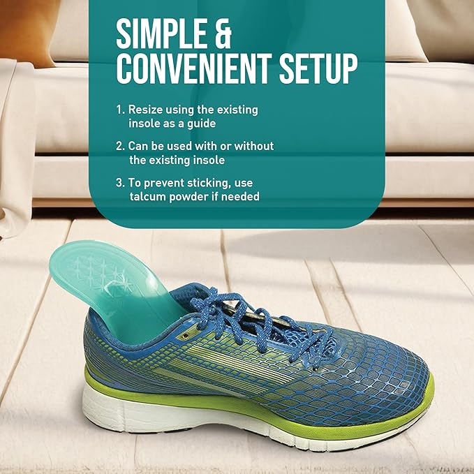 • HOW TO USE: Insert silicone insole in shoe after resizing it (use existing insole for resizing). Can be used with or without existing insole depending on your comfort. In case if you feel the insole is sticking to your feet you can use talcum powder on the insole. (Washing Instructions: Wash using mild soap and air dry after washing)