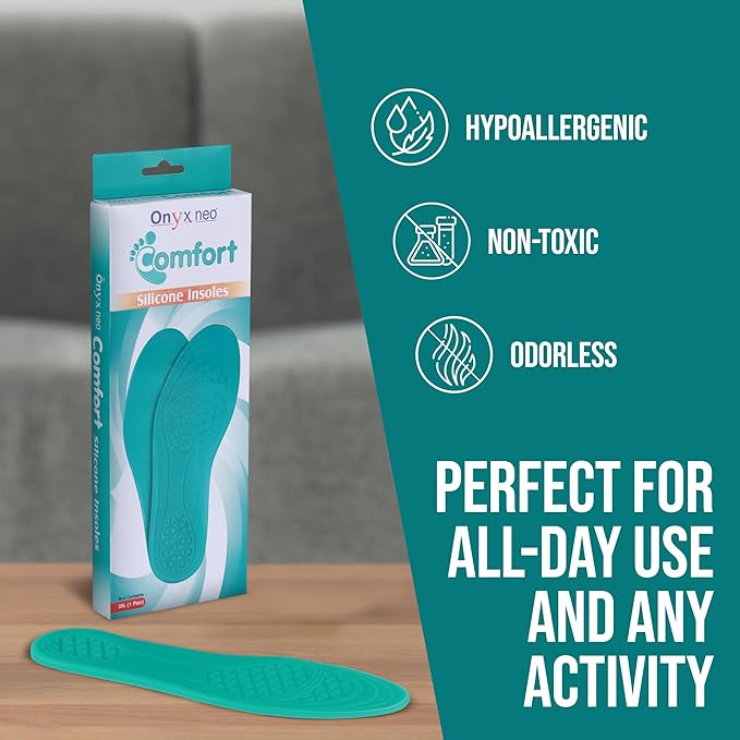 • SUPERIOR QUALITY: Made from 100% Pure Platinum Cured Silicone that resists bacterial growth and does not dry out (harden). Hypoallergenic material with a slim design that is anti-slip, anti-friction and shock absorbing. The insole fits any shoe is non-toxic, washable, odourless and durable.
