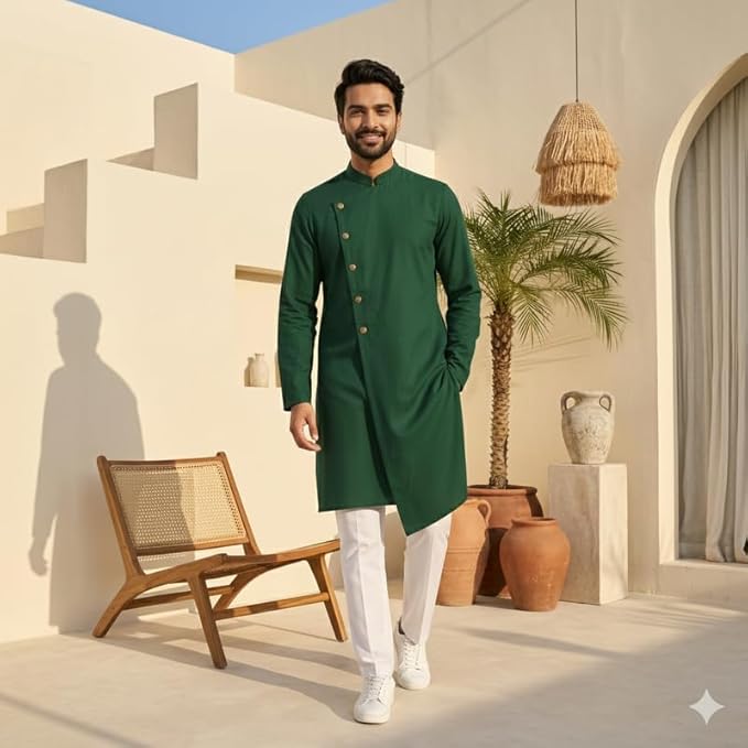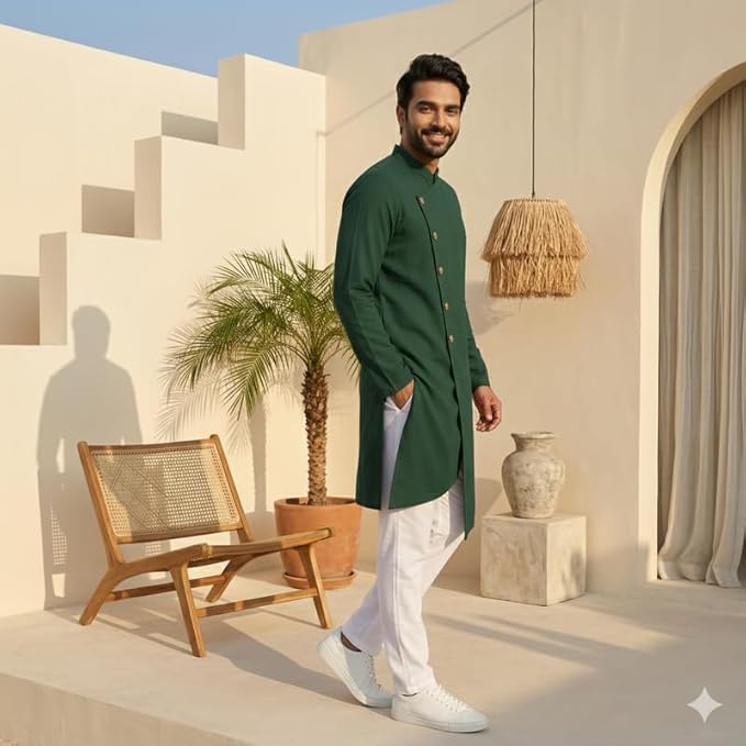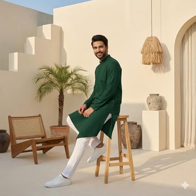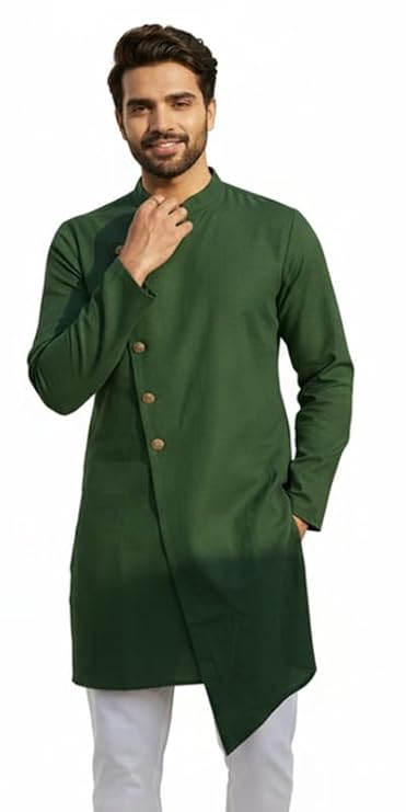 • Elegant Design & Premium Fabric: Crafted in a rich Olive Green tone, the high-neck kurta features full sleeves and a sleek, tailored fit that exudes understated elegance. Made from premium-quality fabric, it offers unmatched comfort, breathability, and a polished look that lasts through any occasion.