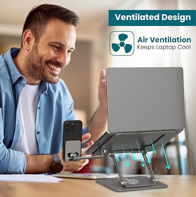 • 2-in-1 Laptop & Phone Stand: Keep your workspace clutter-free with this dual-purpose stand that holds both your laptop (up to 15.6@) and smartphone side-by-side for multitasking ease.