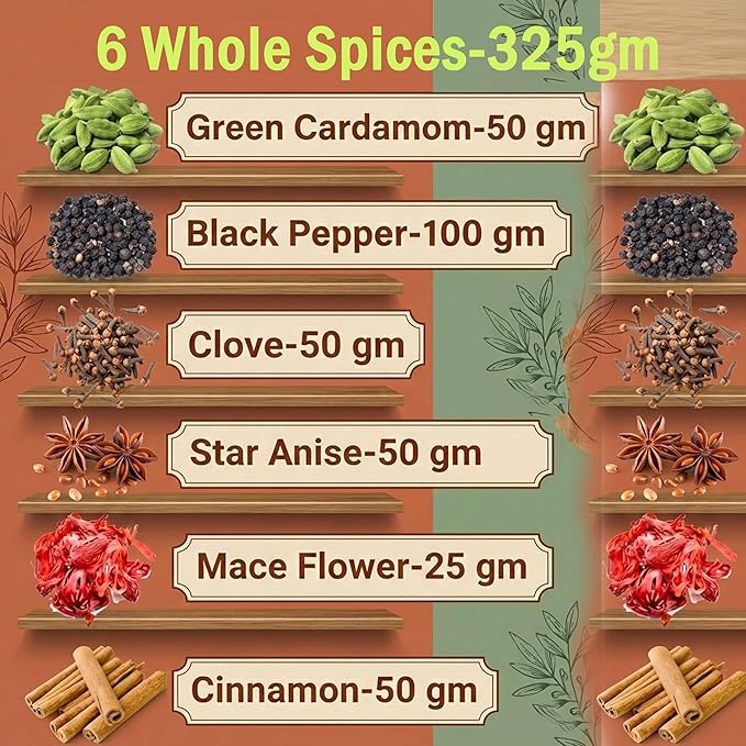 Complete Spice Collection: Premium combo pack includes 6 essential whole spices - Green Cardamom, Black Pepper, Clove, Star Anise, Mace, and Cinnamon Sticks for authentic Indian cooking