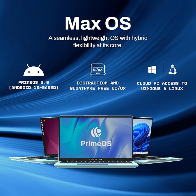 • Android 15-based PrimeOS 3.0: Experience the full Android ecosystem on a laptop-optimised interface. Enjoy multi-window multitasking, full-screen app support, a desktop-style file manager, browser, and smooth keyboard + trackpad input for true laptop functionality.
