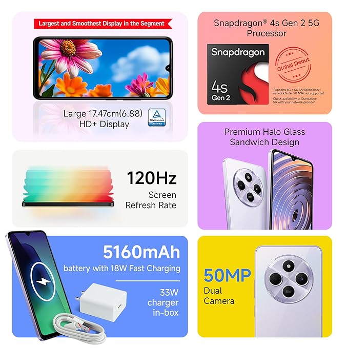 High performance - Snapdragon 4s Gen 2 5G Processor | Large 17.47cm 120Hz Display | Upto 8GB RAM including 6GB Virtual RAM |128GB Storage | Fast Side fingerprint sensor