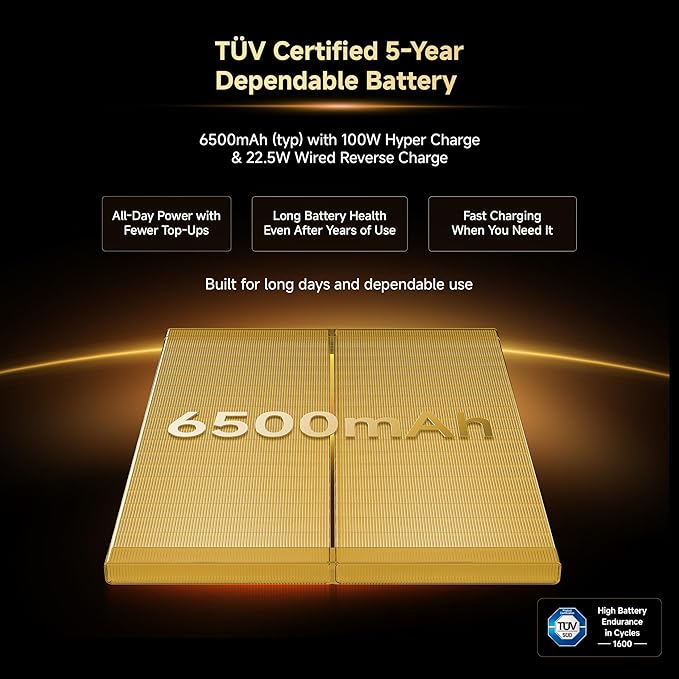 • Silicon carbon 6500mAh battery with 100W Hypercharge and 22.5W reverse charging having advanced 1600 lifecyclesFibre glass back panel with Corning Gorilla Glass Victus 2 to survive rough drops and highest waterproofing (IP69K) along with AI Wet Touch 2.0