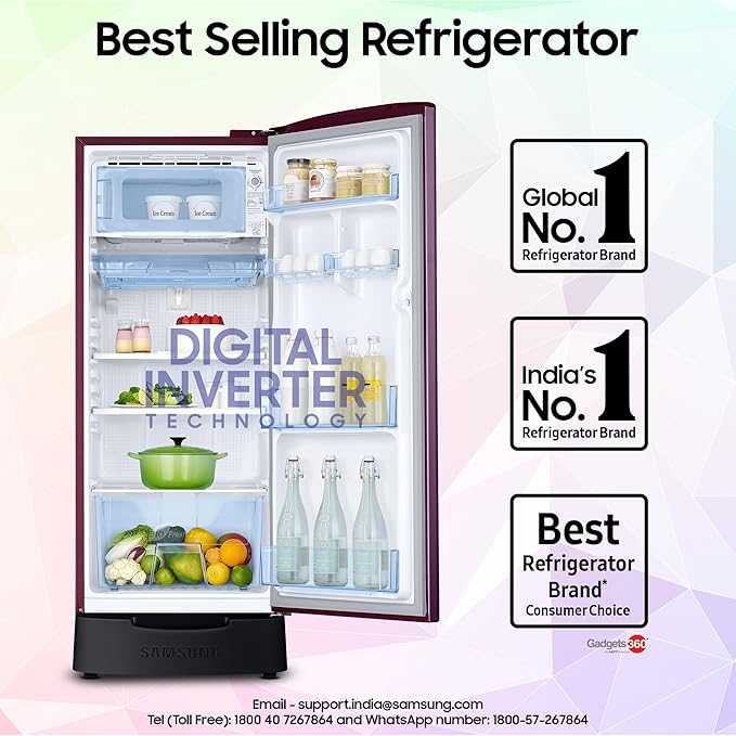 Samsung 183 L, 4 Star, Digital Inverter, Direct-Cool Single Door Refrigerator (RR20C1824CR/HL, Red, Camellia Purple, Base Stand Drawer)