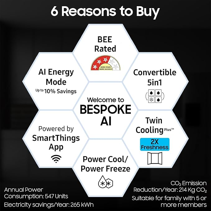 • Special Features : Bespoke AI | Convertible 5-in-1 | Twin Cooling Plus| Wi-Fi Embedded | Smart Things App | Smart Things AI Energy Mode | Power Freeze | Power Cool | Fingerprint Resistant | Built-in Look