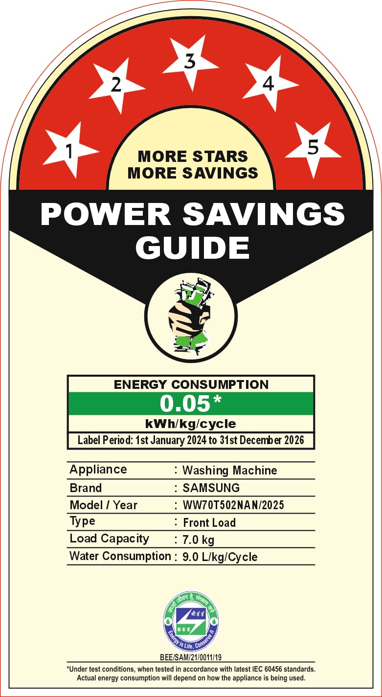 Energy Star rating : 5 Star- Best in class efficiency | Digital Inverter for energy savings | Energy Consumption: 0.05 KWh/kg/cycle (For more information refer to BEE Label)