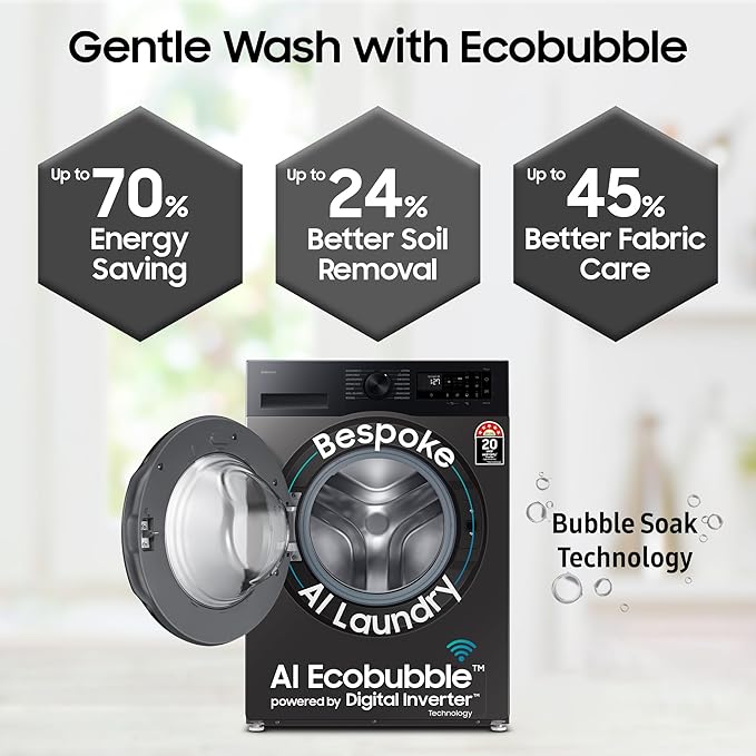 Key Performance Features: AI Ecobubble with 45% better fabric care| AI Energy Mode for up to 70% energy savings | AI Touch Control | Wi-Fi Embedded - Operate remotely| Smartthings for home integration| Hygiene Steam| Super Speed - Wash is just 39 minutes | SpaceMax - More Inside, Same outside| Quick Wash| Bubble Soak| Drum Clean+ Removes dirt and 99.9% of odor-causing bacteria| Pre Wash| In-built Heater for Hot & Cold wash
