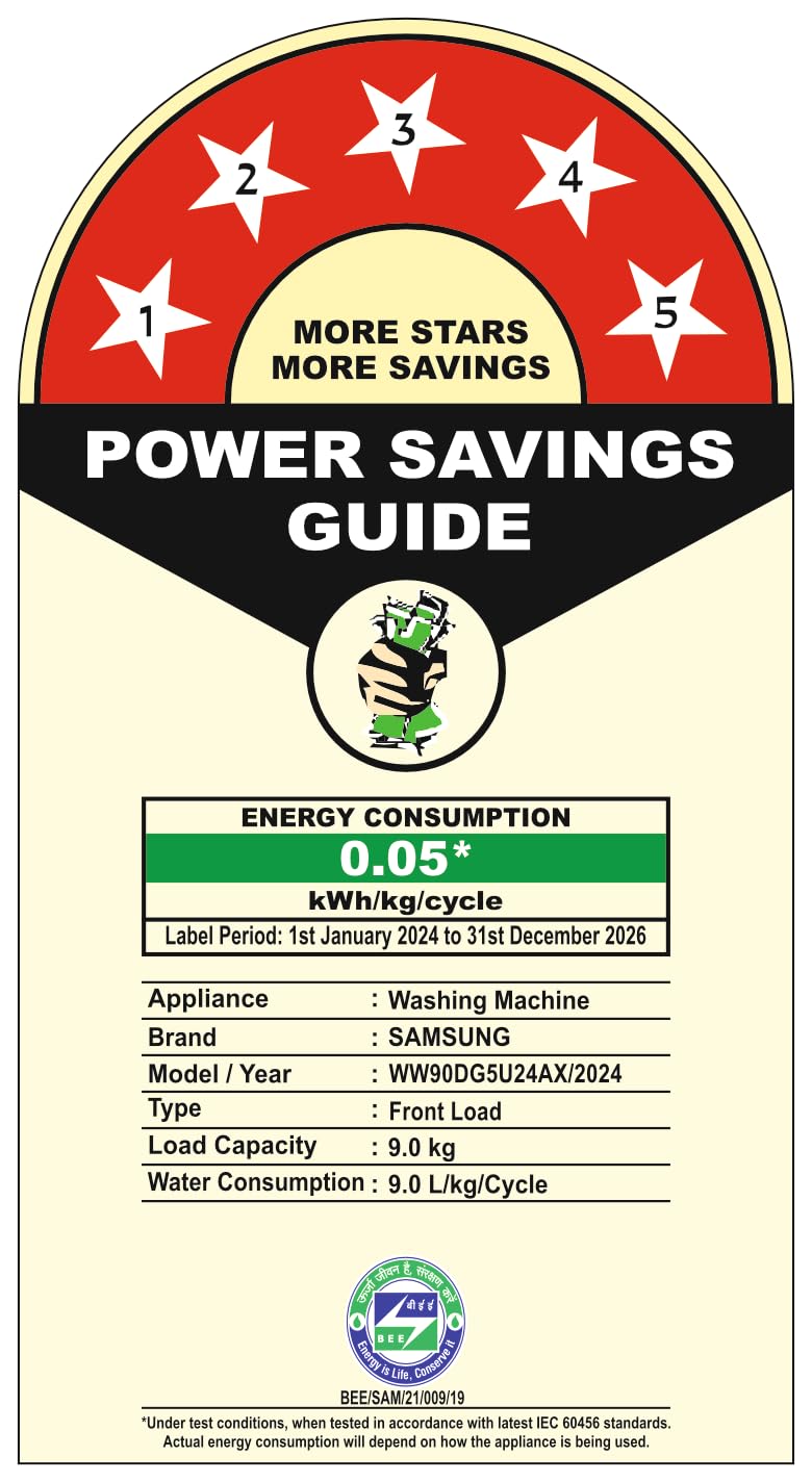 Energy Star rating : 5 Star- Best in class efficiency | Powered by AI Energy Mode and Digital Inverter Technology for Energy Savings(up to 70%) | Energy Consumption: 0.05 KWh/kg/cycle (For more information refer to BEE Label)