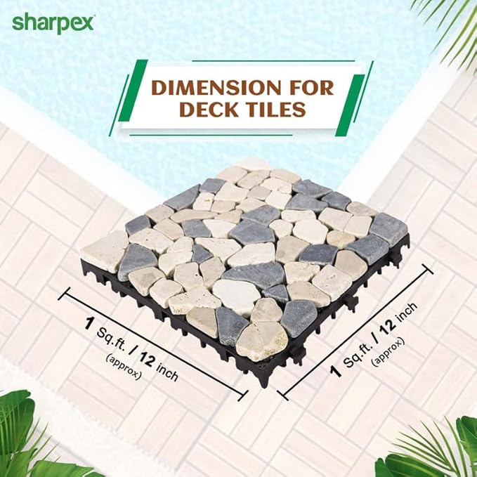 • Artificial Flooring: The Pebble deck tiles are made from pebble stones, which is sanded and oiled for a beautiful smooth appearance. These Stone deck tiles are compatible with any Sharpex deck tile, allowing you to create the design of your choice. Mix & match these wooden tiles with grass, stone, WPC tile for an elegant look. Deck Tile size approx. 12x12 inches.