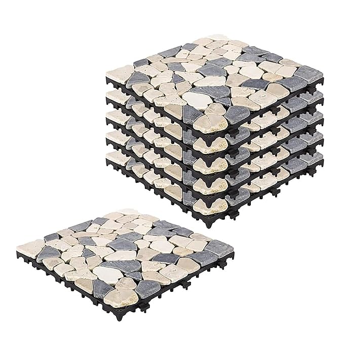 • Easy to Clean and Maintain: The Pebble stone Deck tiles fits effortlessly into place and cover your balcony, patio, or terrace in minutes, and they are low maintenance, requiring just a brush and a damp cloth to clean. The interlocking tiles are Ideal for gazebos, patios, pool sides, concrete, turf, and other hard or semi-hard surfaces.
